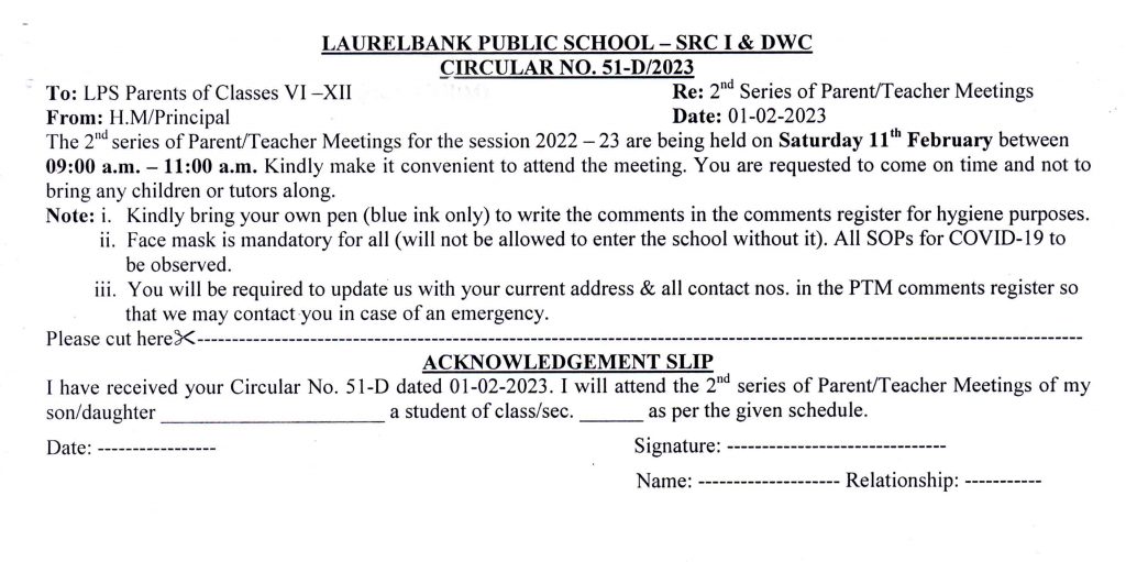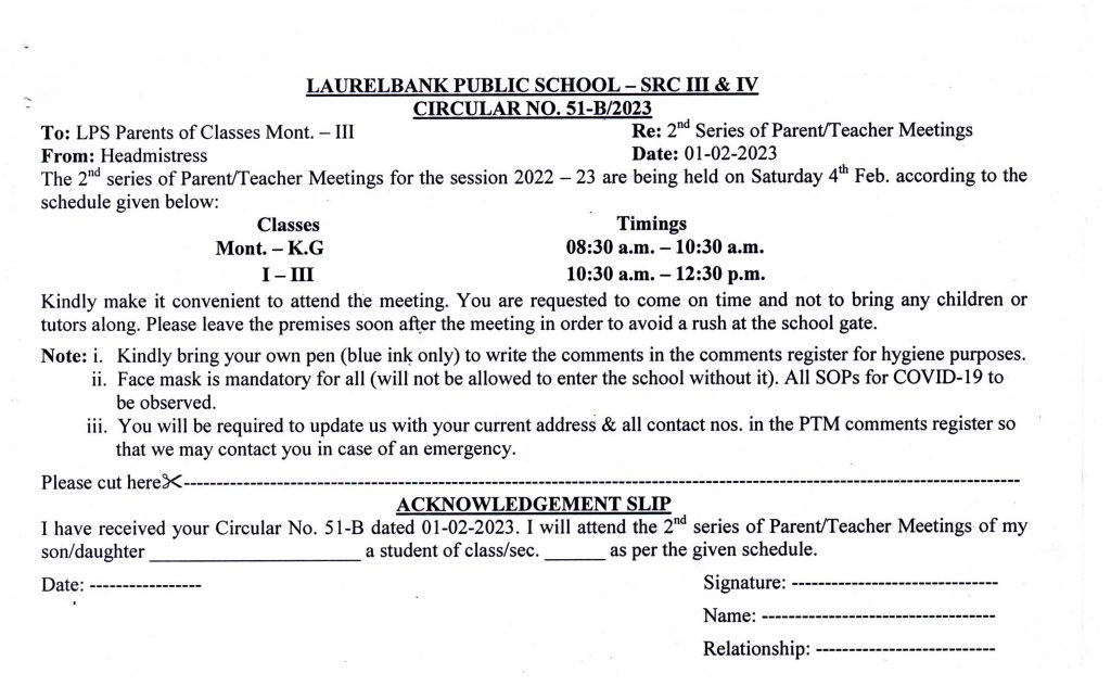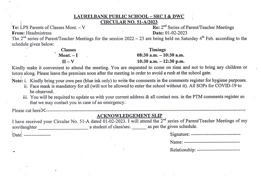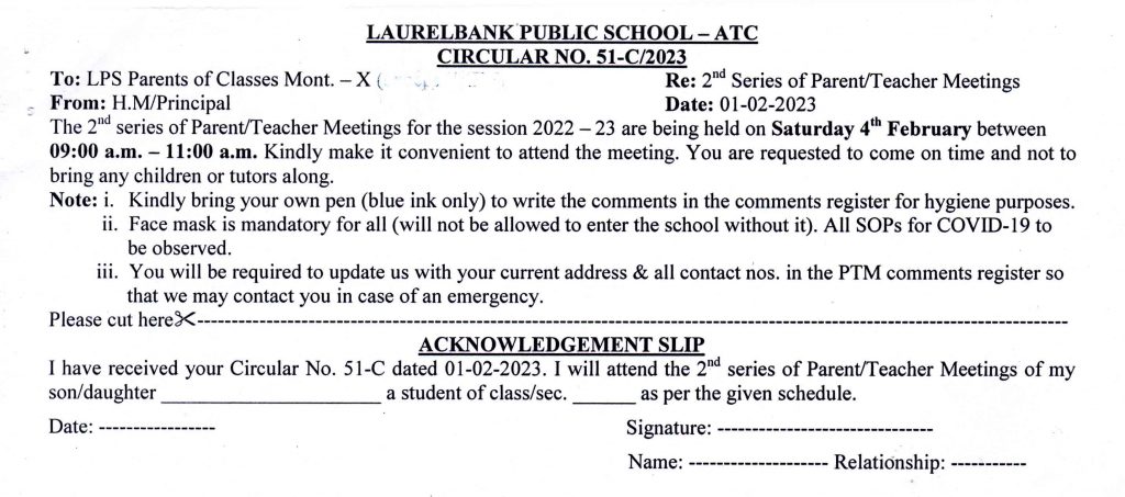 Circular No. 51-A, 51-B, 51-C & 51-D (2nd Series of Parent / Teacher Meetings) Dated: 01 February, 2023